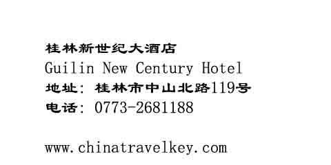 New Century Hotel Guilin is a 3-star standard hotel located in Die Cai District of Guilin, surrounded by very graceful environment. It is a combination of accommodation, travel, business, entertainment and shopping.