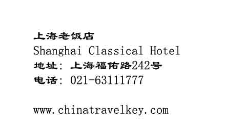 Classical Hotel Shanghai, whose original name was Rongshun Restaurant, was founded in the 1875. It is located in the Yuyuan Garden Tourism Area. This hotel, with its classical outlook and the convenient of the transport link, has become one of the favorite hotel in Shanghai.