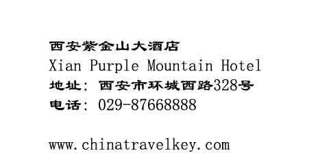 Purple Mountain Hotel Xian, located at the starting point of the Silk Road, a busy part of the city, is sponsored by the Peoples Government of Jiangsu Province. The hotel is about 45 minutes' drive to the airport, 20 minutes' dirve the famous Bell Tower and 40km to the world famous Terracotta Army site.